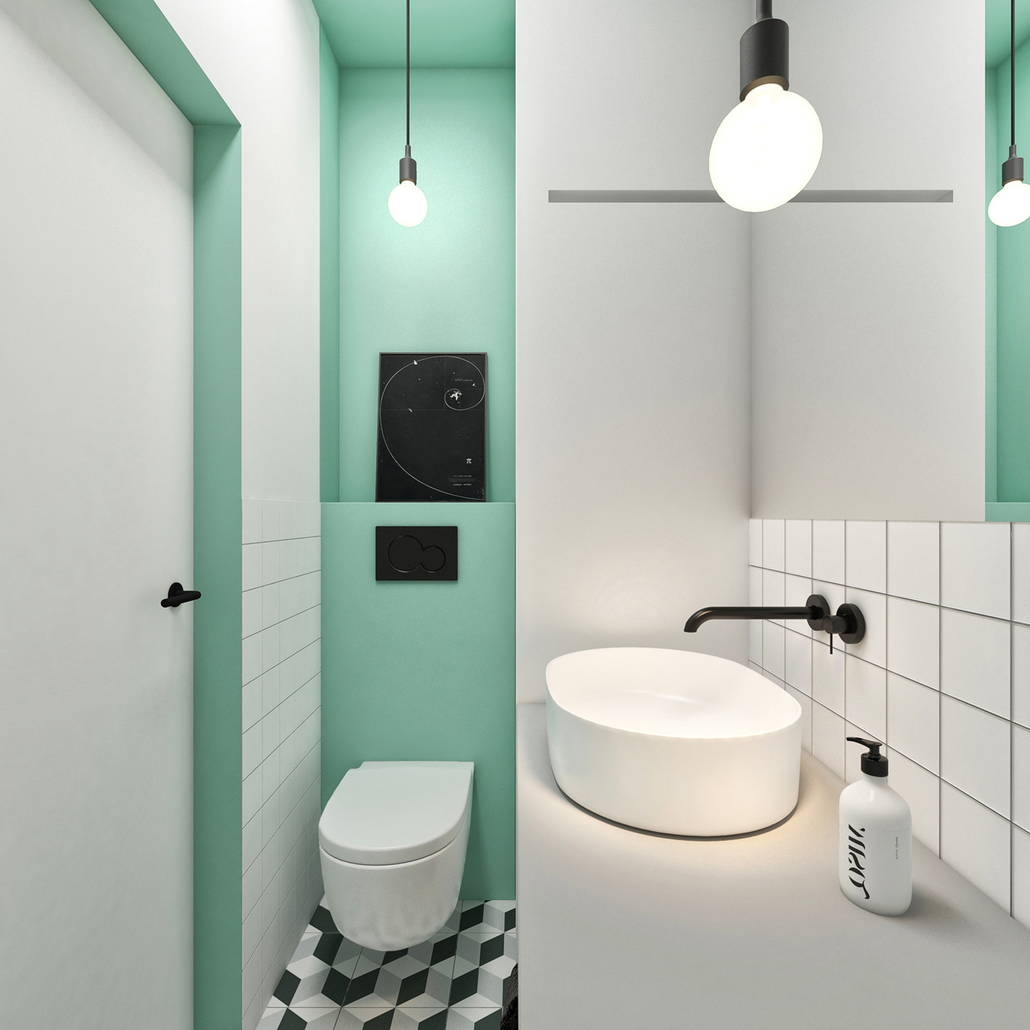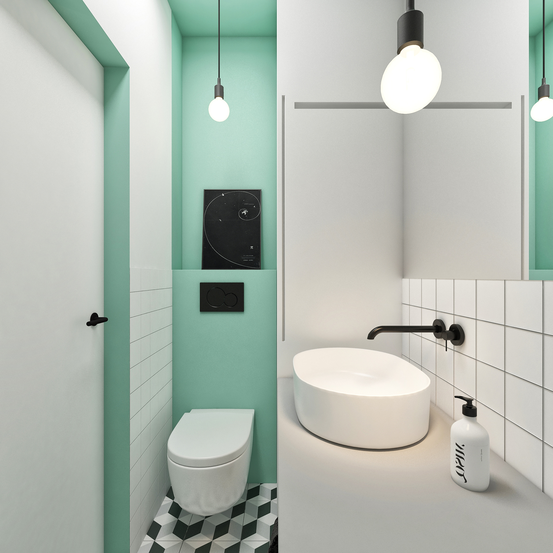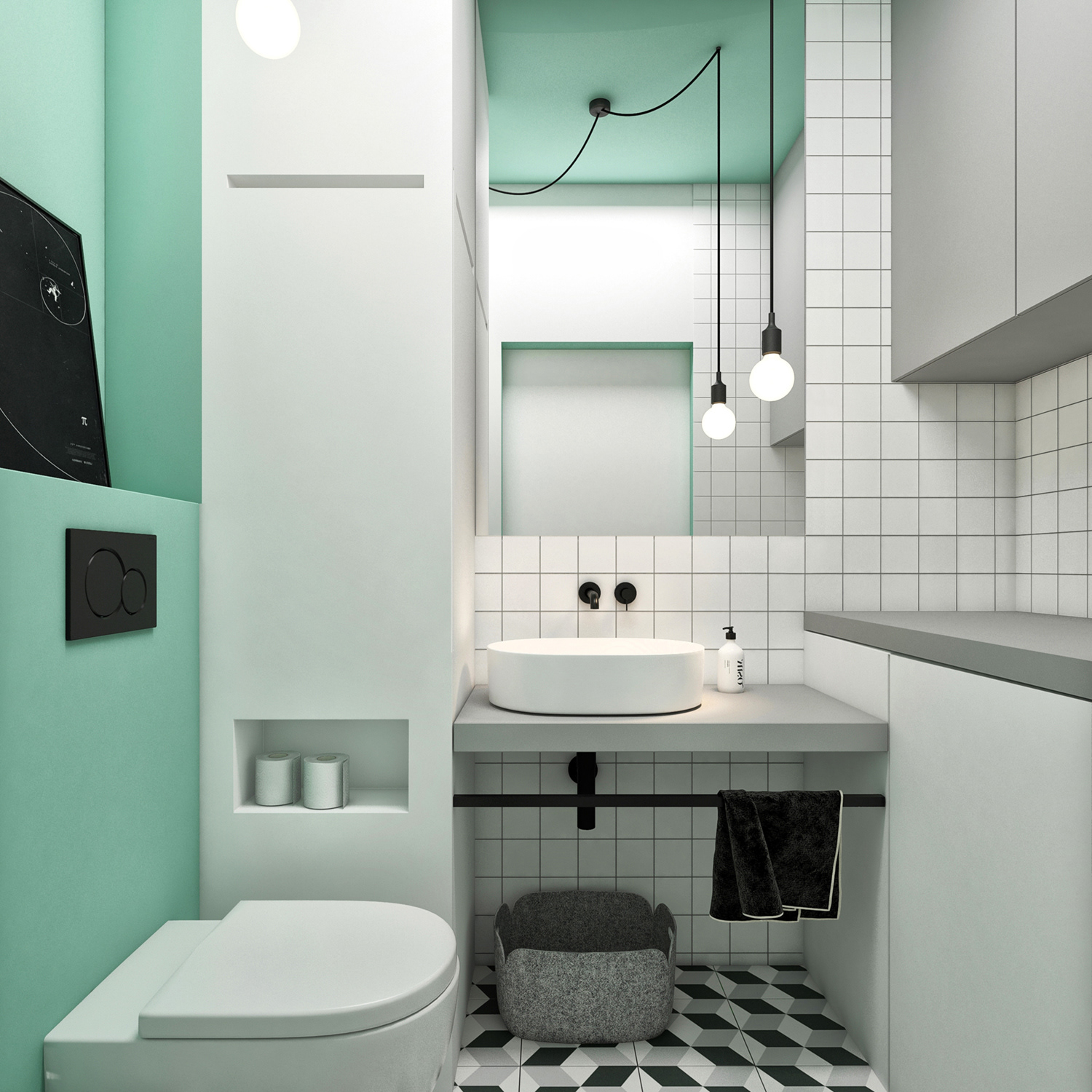 Minimalistyczna forma + mocny akcent kolorystyczny. Jedna z koncepcji dla łazienki we Wrocławiu